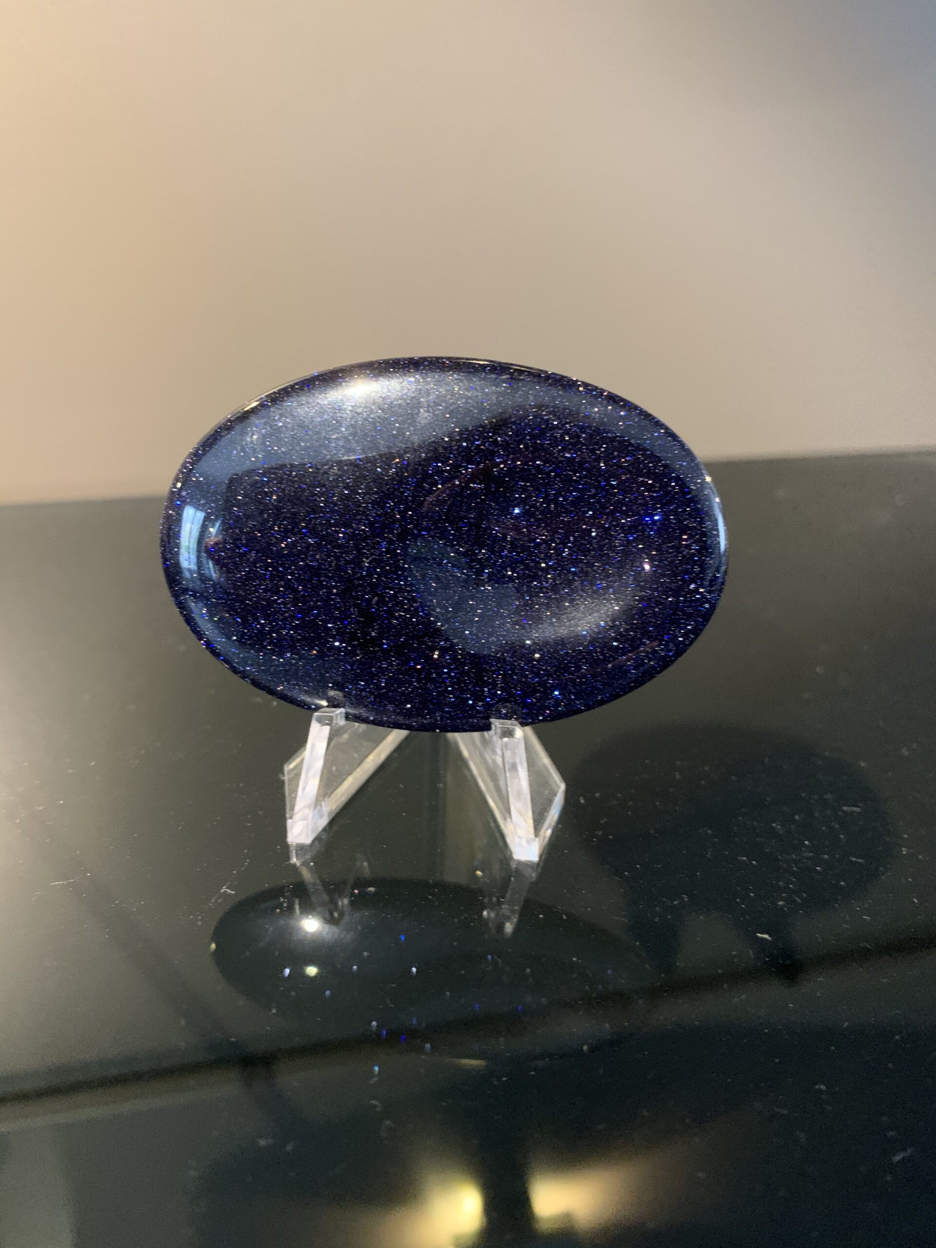 Blue Goldstone, which is associated with the throat chakra. Harnessing the properties of copper, Goldstone has the effect of boosting life-force and promoting vitality. It aids significantly in increasing the strength of circulation in the body, ensuring bone density and reducing arthritic inflammation as well as reducing stomach pains or grumbling, experienced from anxiety